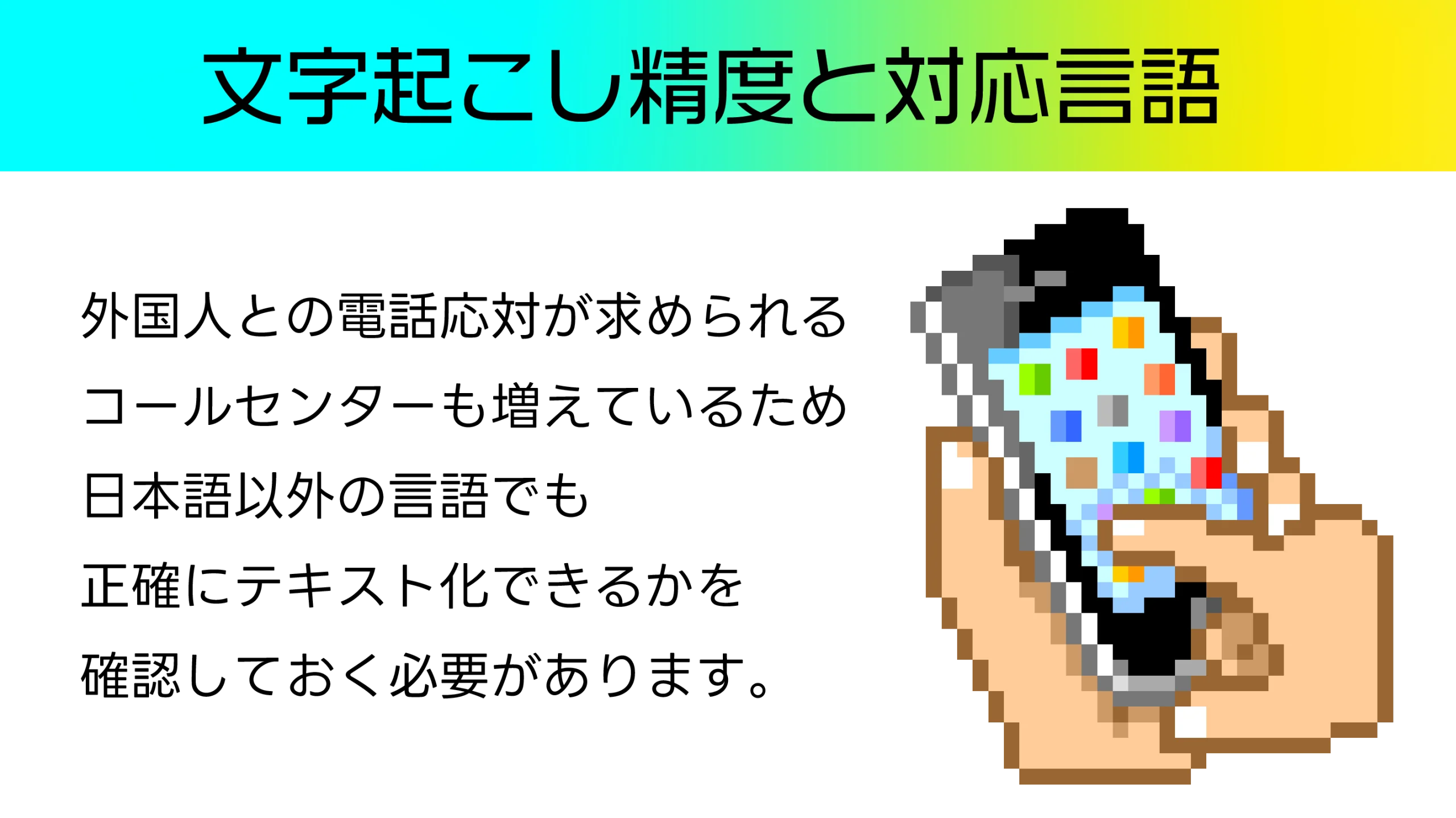また、昨今では、外国人との電話応対が求められるコールセンターも増えているため、日本語以外の言語でも、正確にテキスト化できるかを確認しておく必要があります。