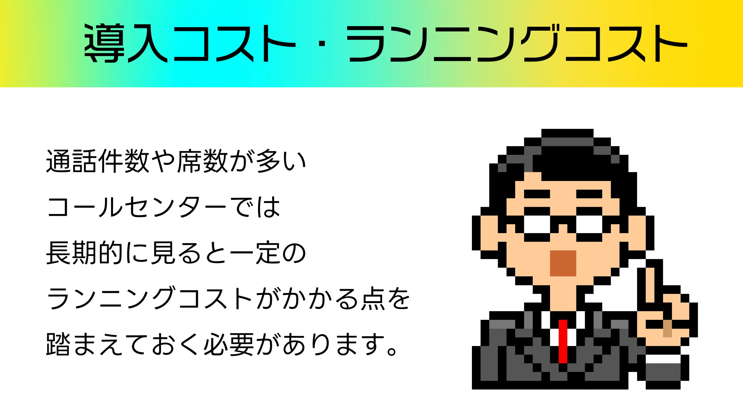 例えば、クラウド型の場合、初期費用は比較的安く抑えられますが、月額利用料や従量課金によって継続的なコストが発生します。通話件数や席数が多いコールセンターでは、長期的に見ると一定のランニングコストがかかる点を踏まえておく必要があります。