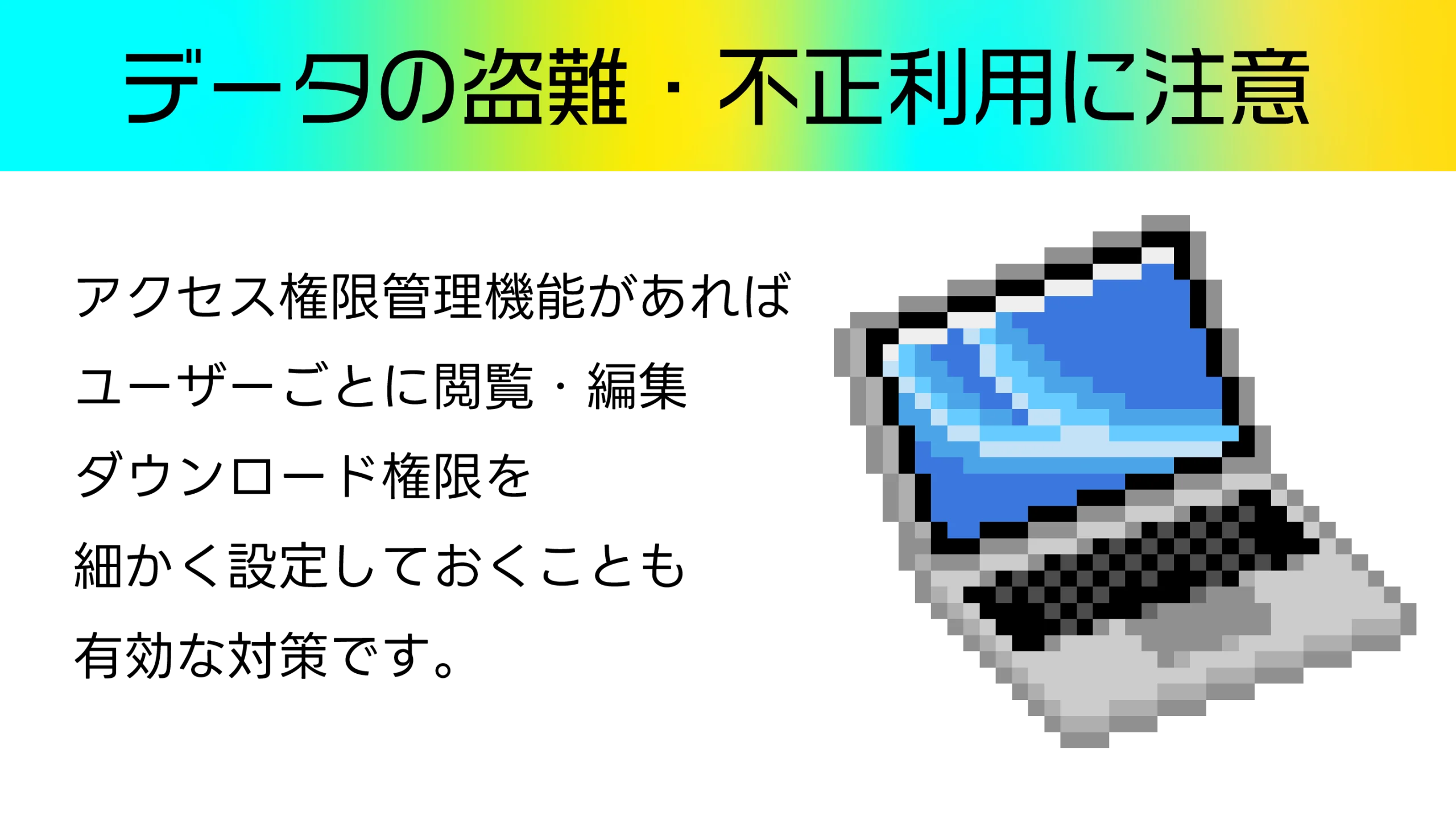 アクセス権限管理機能があれば、ユーザーごとに閲覧・編集・ダウンロード権限を細かく設定しておくことも有効な対策です。