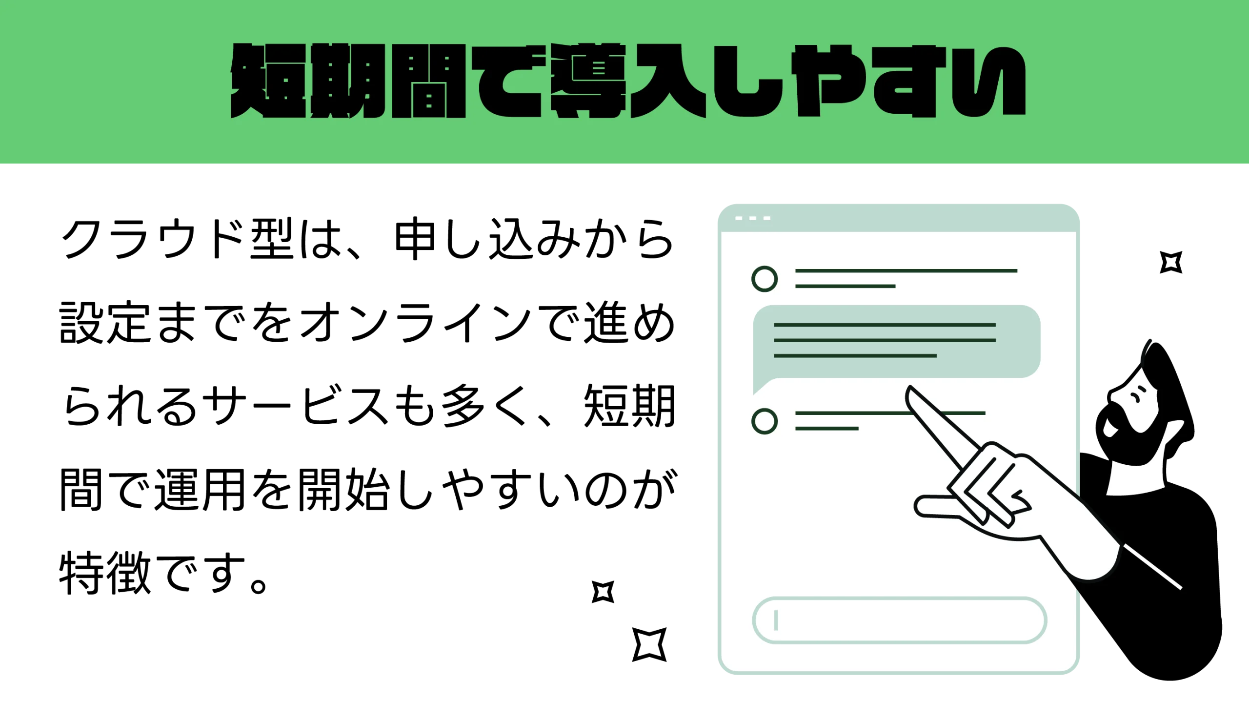 クラウド型は、申し込みから設定までをオンラインで進められるサービスも多く、短期間で運用を開始しやすいのが特徴です。