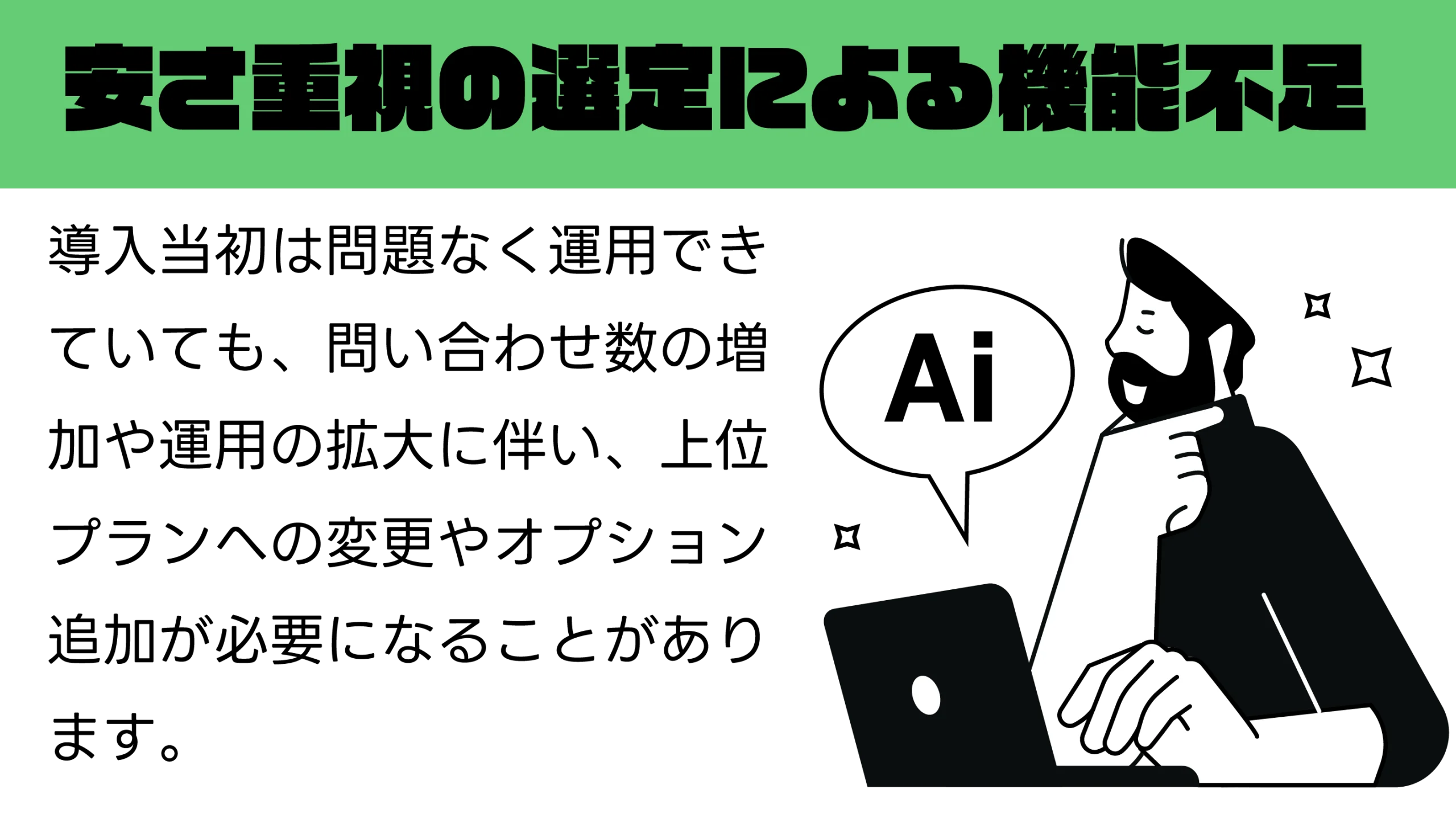 導入当初は問題なく運用できていても、問い合わせ数の増加や運用の拡大に伴い、上位プランへの変更やオプション追加が必要になることがあります。その結果、当初想定していたよりも月額費用が高くなるケースも見られるため、初期費用の安さだけでなく、長期的な運用コストも含めて検討することも大切です。
