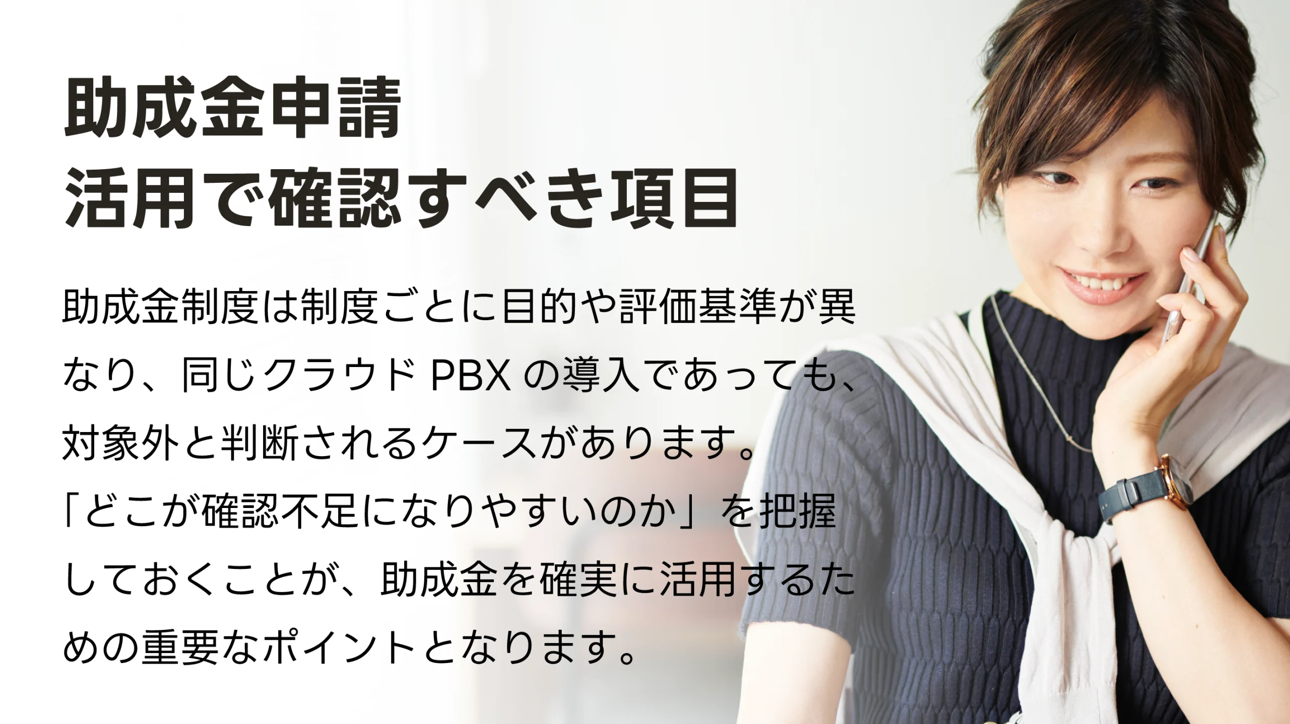 特に、助成金制度は制度ごとに目的や評価基準が異なり、同じクラウドPBXの導入であっても、整理の仕方によっては対象外と判断されるケースがあります。
