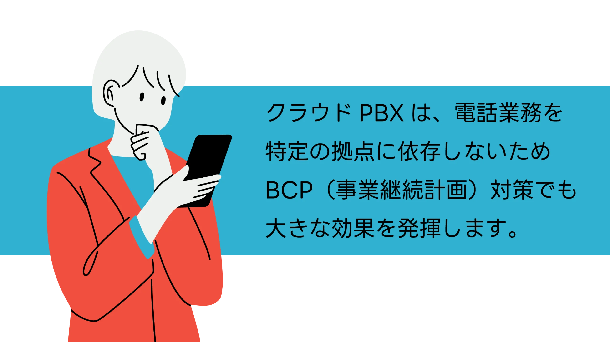 このように、クラウドPBXは、電話業務を特定の拠点に依存しないため、BCP(事業継続計画)対策のうえでも大きな効果を発揮します。
