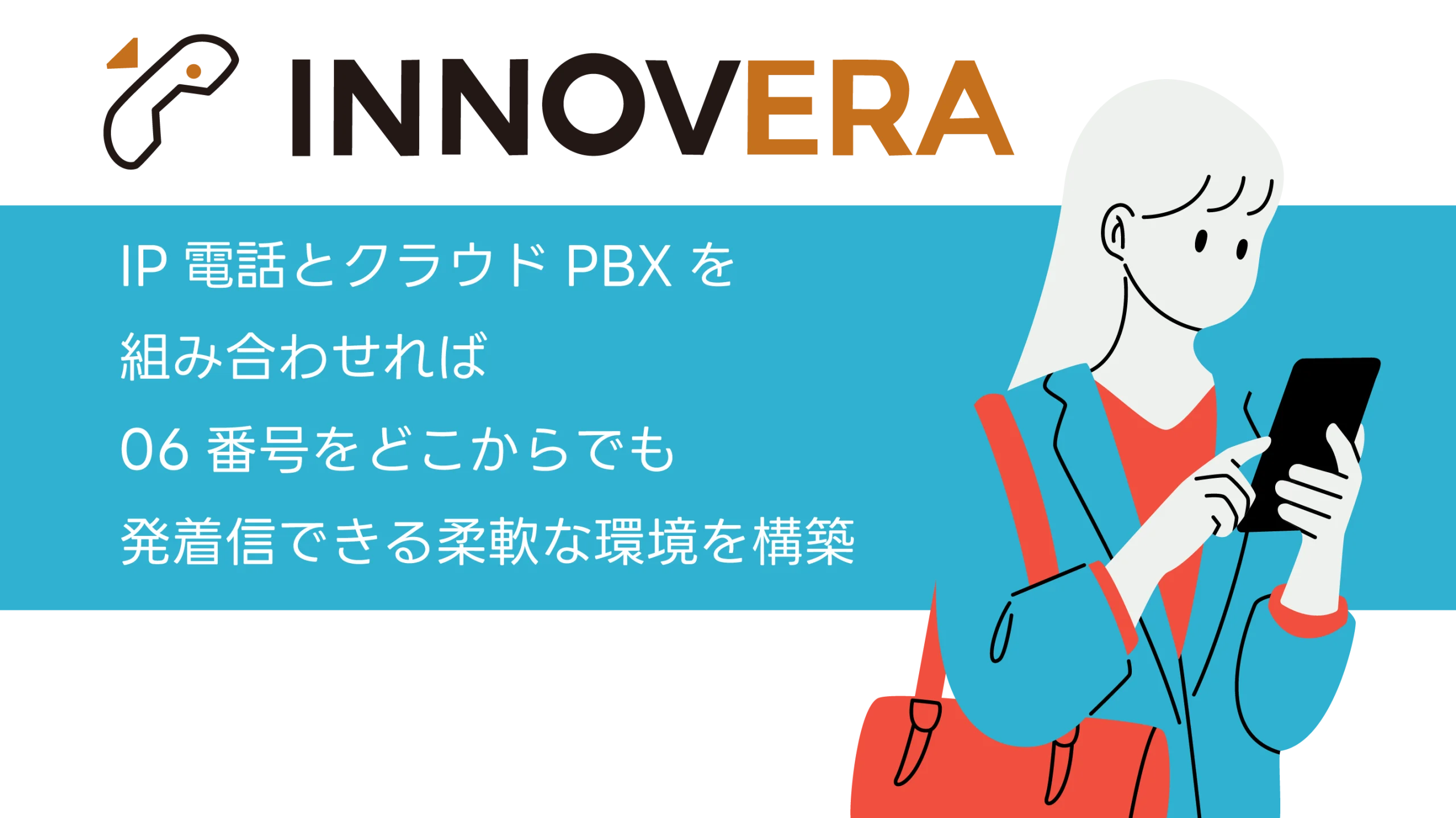 当社では、IP電話サービス「IP-Line」に加えて、クラウドPBX「INNOVERA」も提供しています。両サービスを組み合わせることで、06番号の発着信をクラウド上で一元的に管理でき、スマ-トフォン・PC・SIP電話機から全国どこからでも06番号を利用できる環境を構築できます。