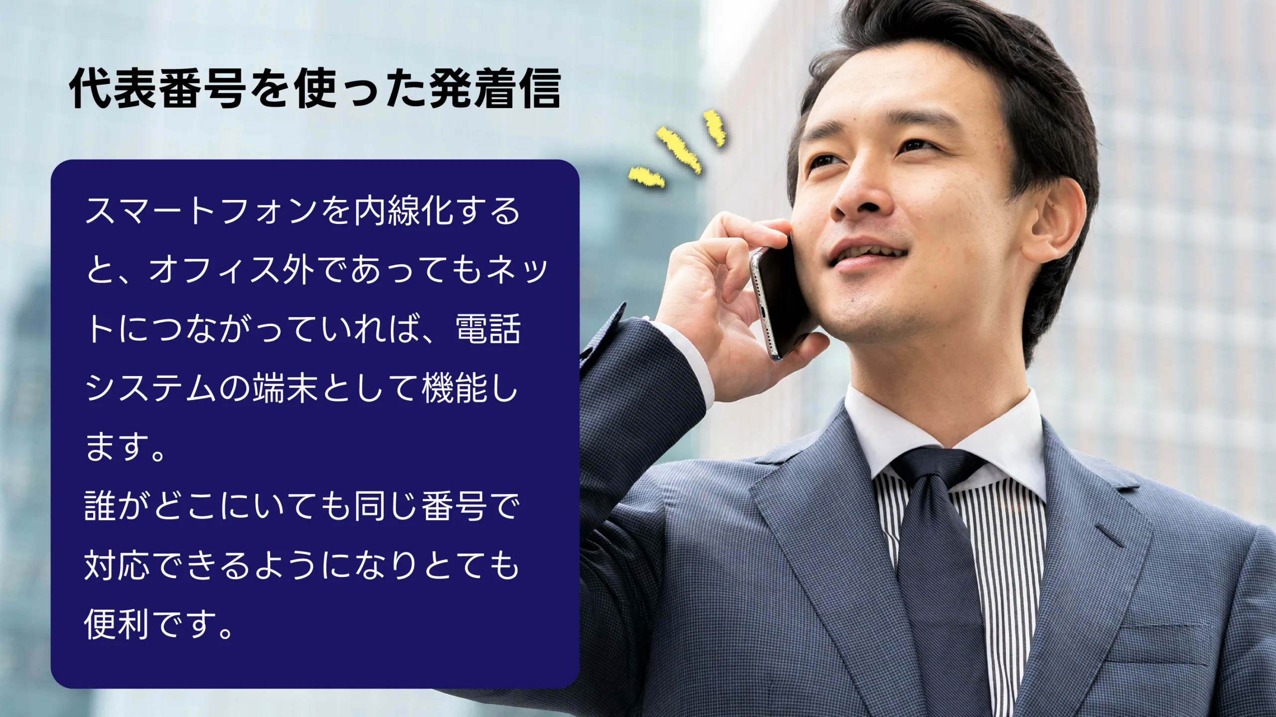 一方、スマートフォンを内線化すると、オフィス外であってもインターネットにつながっていれば、電話システムの端末として機能します。
