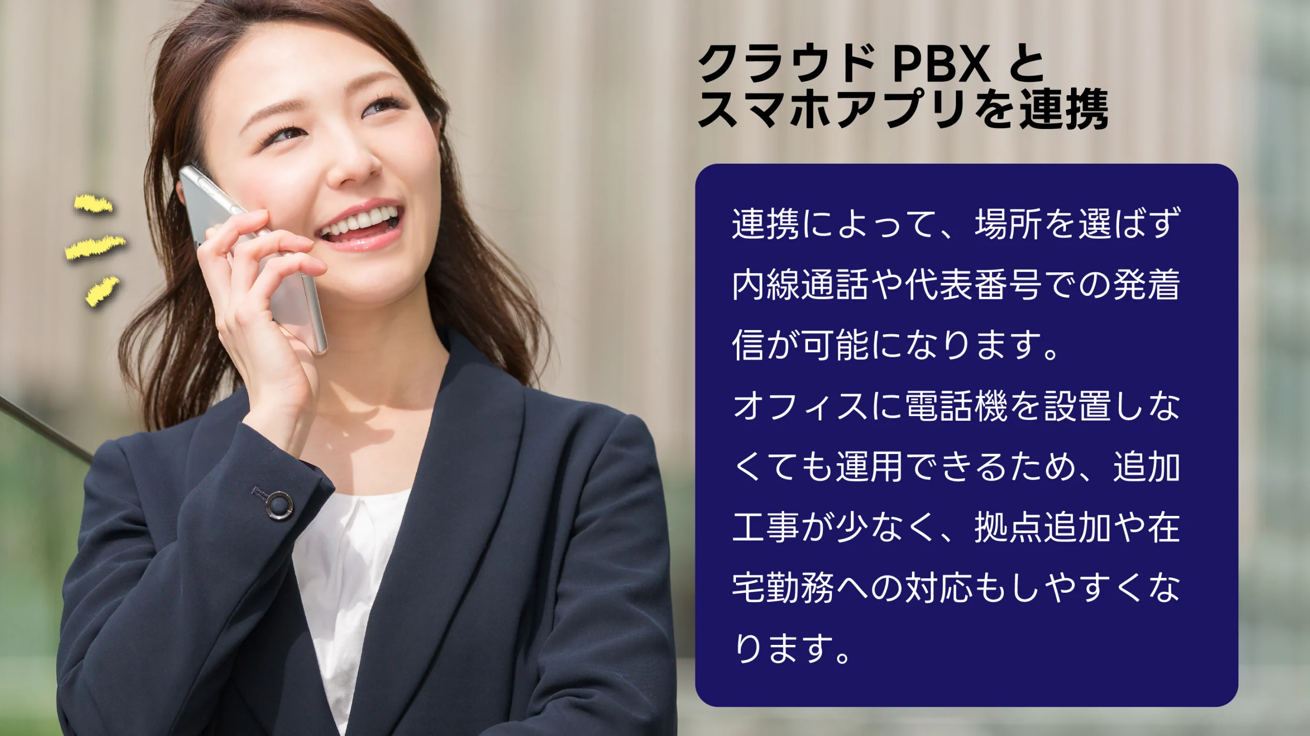 いずれの方法も、スマートフォンに専用アプリをインストールし、インターネット回線を介してPBXと接続する点は共通しています。