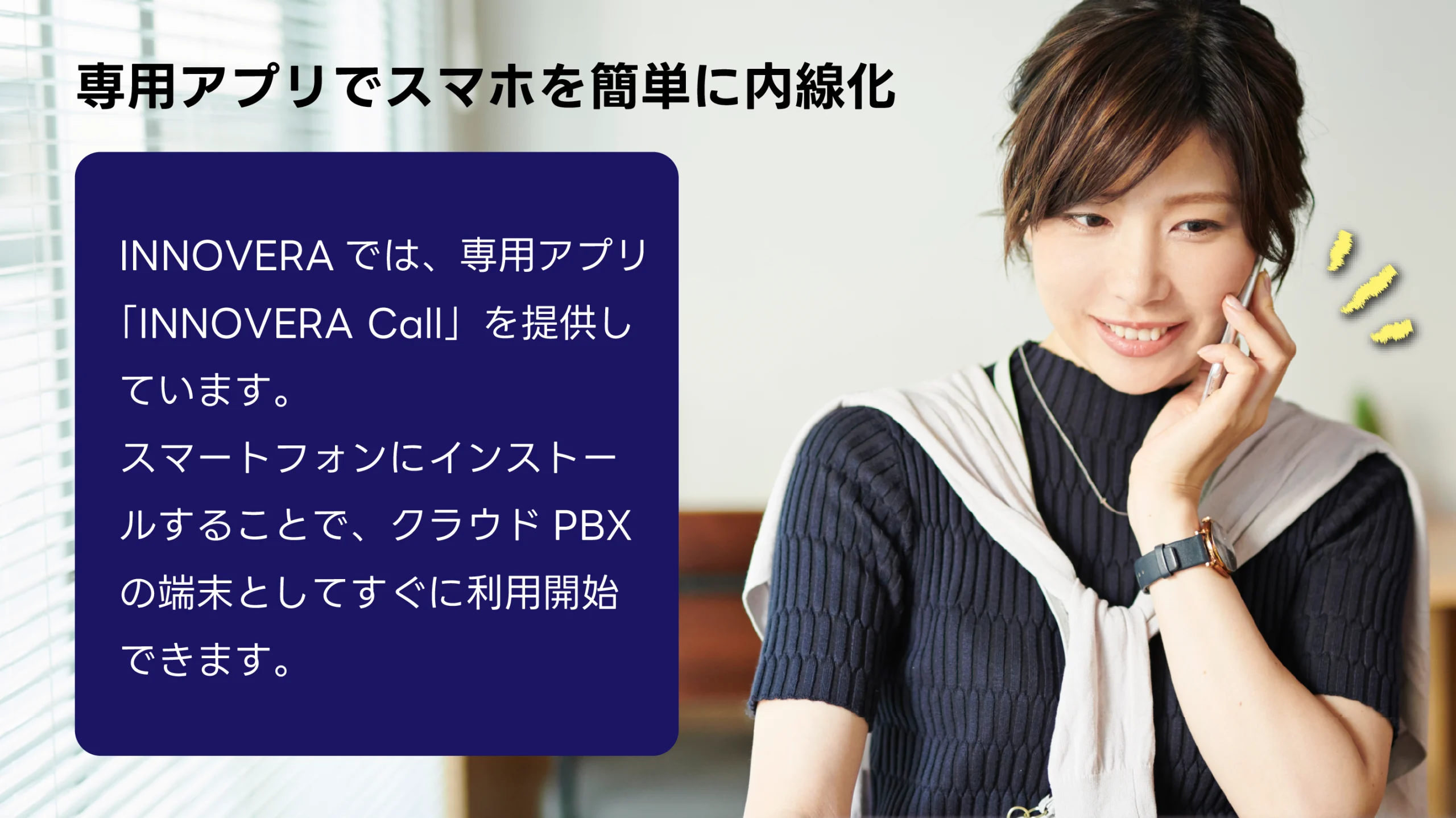 INNOVERAでは、専用アプリ「INNOVERA Call」を提供しており、スマートフォンにインストールすることで、クラウドPBXの端末としてすぐに利用開始できます。