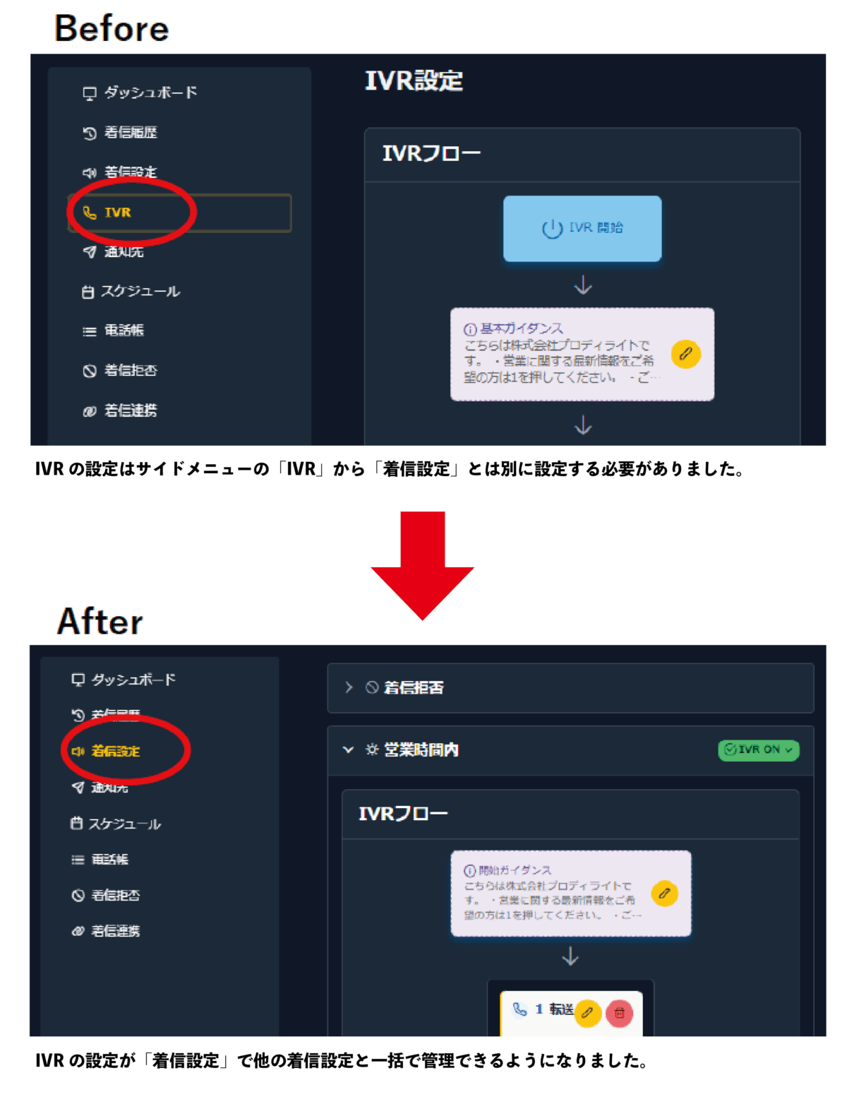 これまでIVRを設定する際には、「着信設定」メニューとは別に存在する「IVR」メニューから設定する必要がありましたが、「着信設定」内に統合いたしました。これにより、着信に関する設定がまとまり、設定や変更が容易になるとともに着信フロー全体をまとめて確認・編集することが可能になりました。