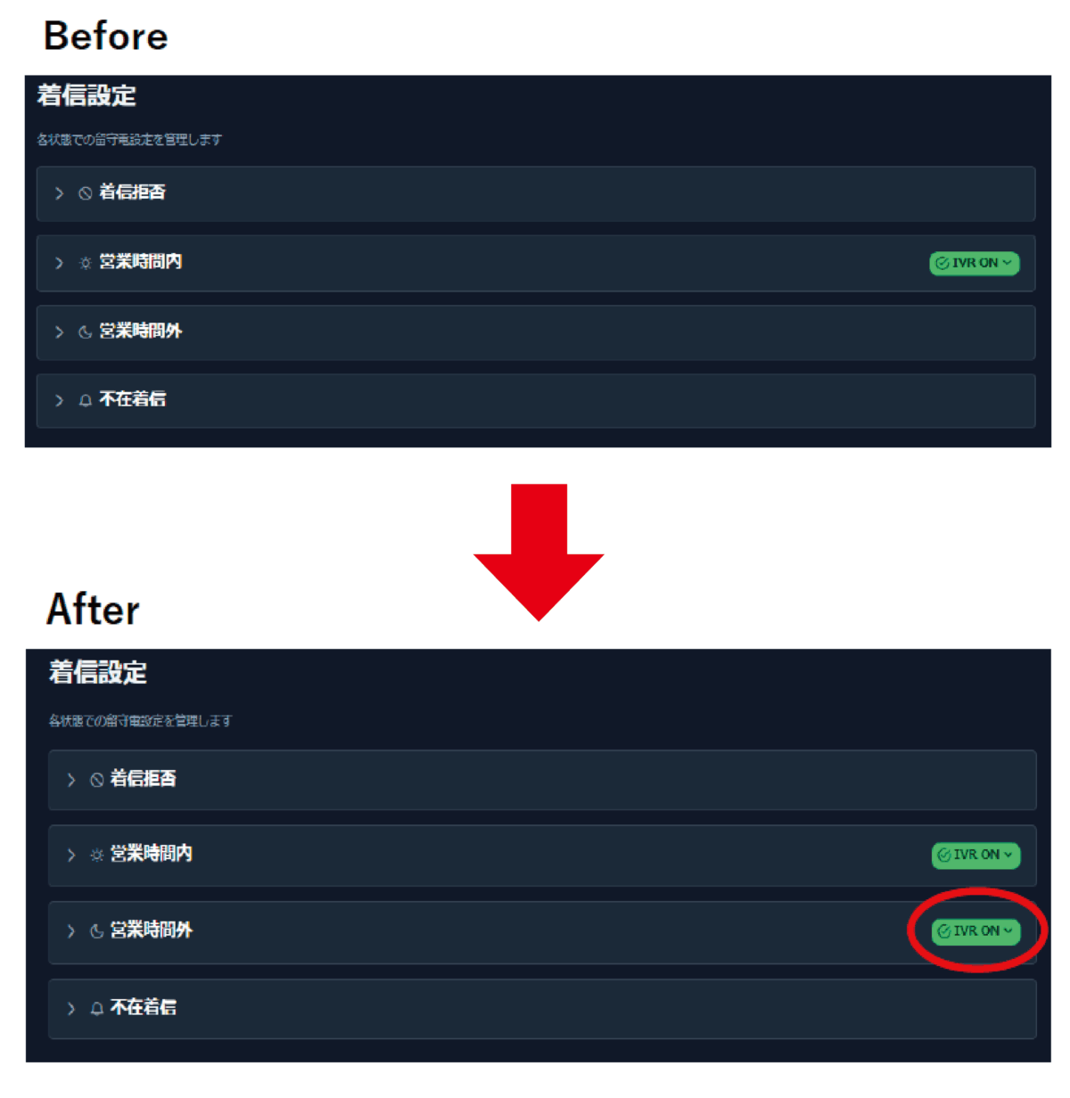 これまでTelfulのIVR(自動音声応答)は設定した営業時間内でしか使用できず、営業時間外の対応は留守番電話か音声ガイダンスの再生のみでした。電話応対の効率化という意味では問題ありませんでしたが、より一層お客様のお役に立てるよう、今回のアップデートでは営業時間外にもIVRが設定できるよう仕様を変更いたしました。自動音声の内容と分岐については営業時間内と営業時間外で異なるものを設定することが可能です。