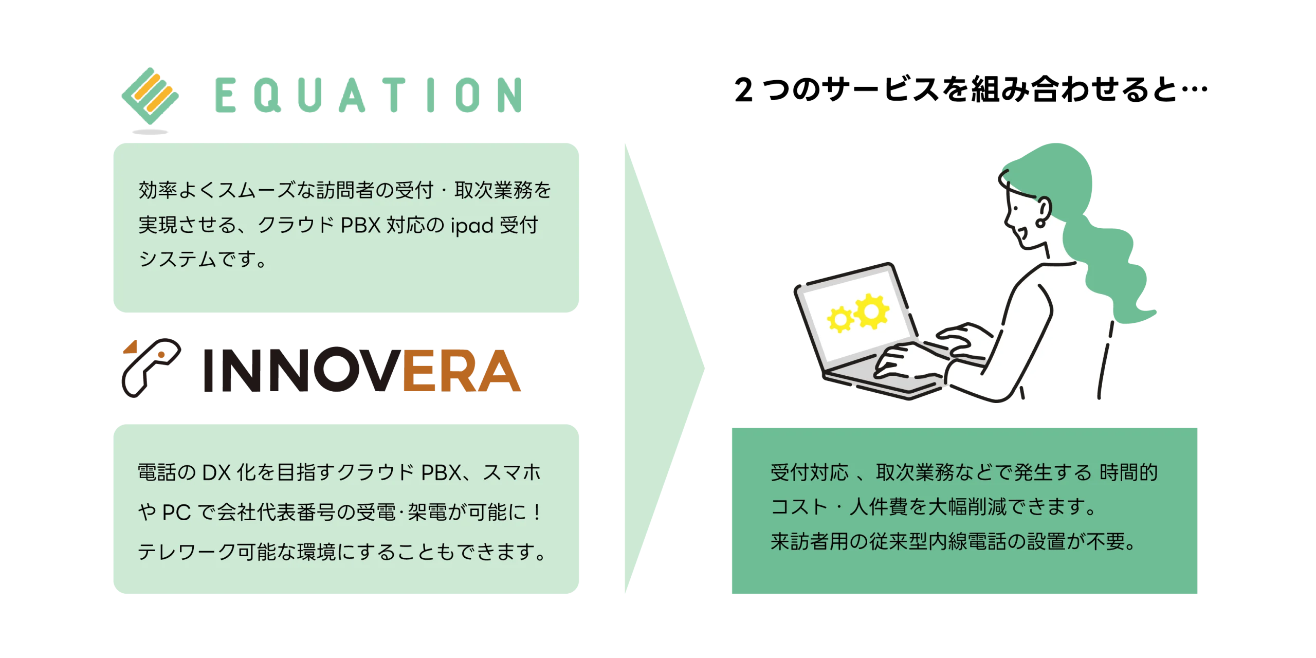 効率よくスムーズな訪問者の受付・取次業務を実現させる、クラウドPBX対応のipad受付システムです。「INNOVERA」と「EQUATION RECEPTION」が連携することで使用することが可能になります。