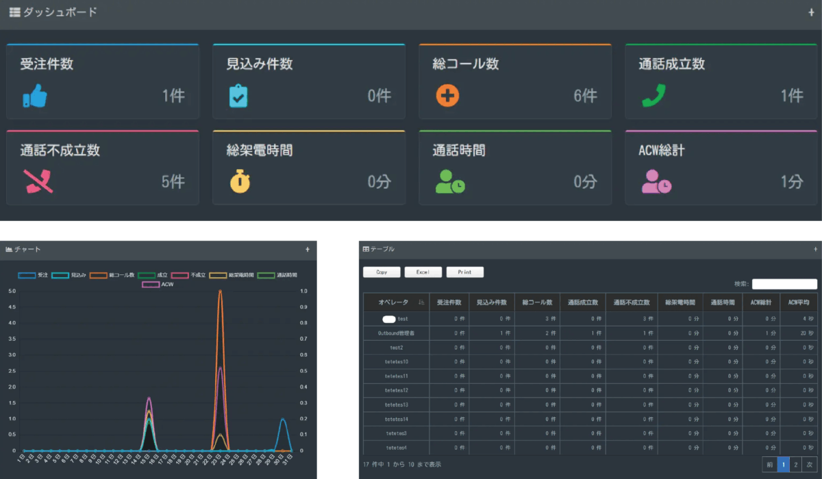 分析画面では「グループ」「オペレータ」「商材」「対象期間」「集計区別」で絞り込みをかけて分析ができます。各ステータスの分析設定タイプに応じて、ダッシュボード形式やチャート形式、テーブル表示でわかりやすく確認できます。 結果データの書き出しも可能です。