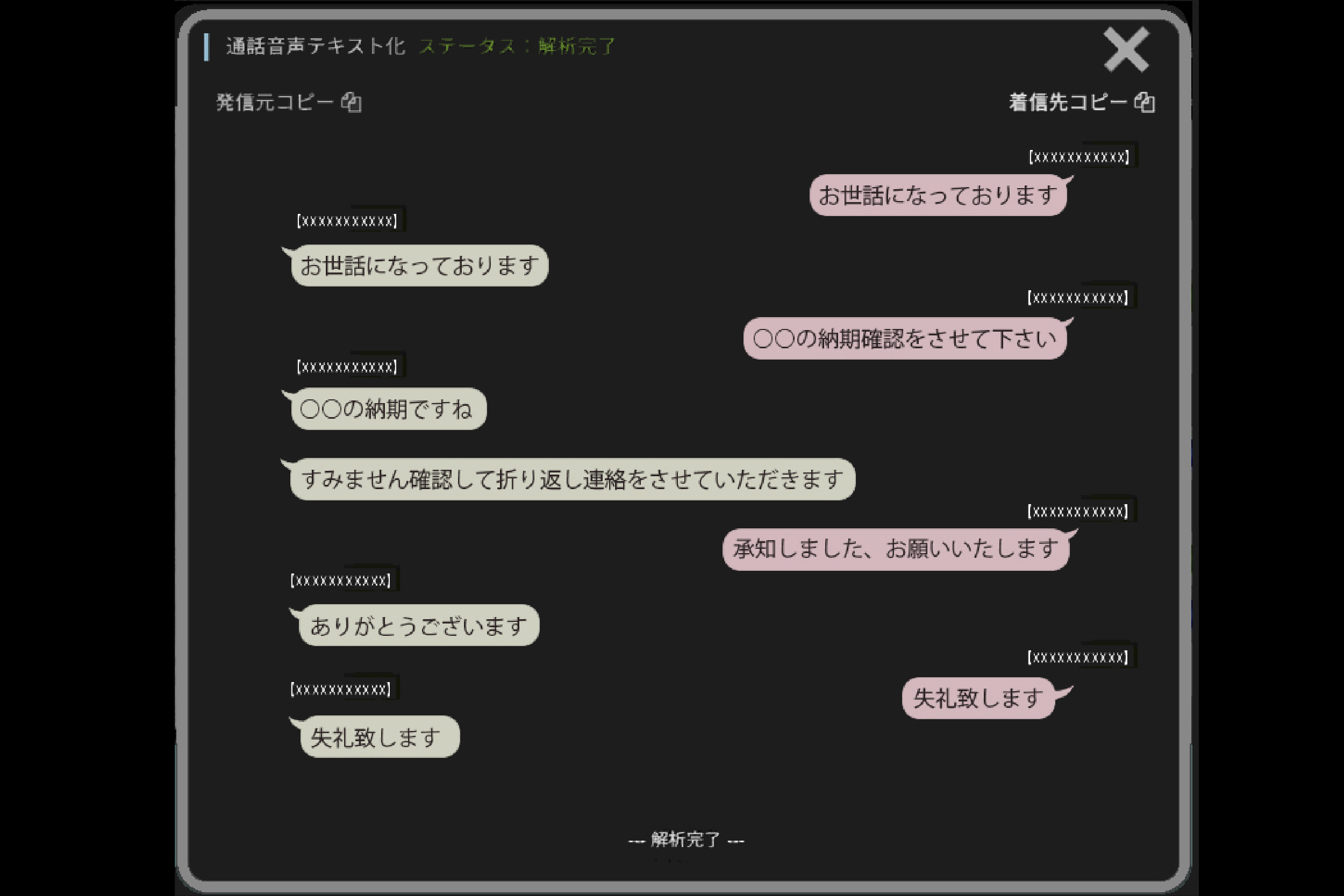テキスト化は音声が流れる速度とほぼ同じ速度で行われ、すぐに通話の内容を確認することができます。 -