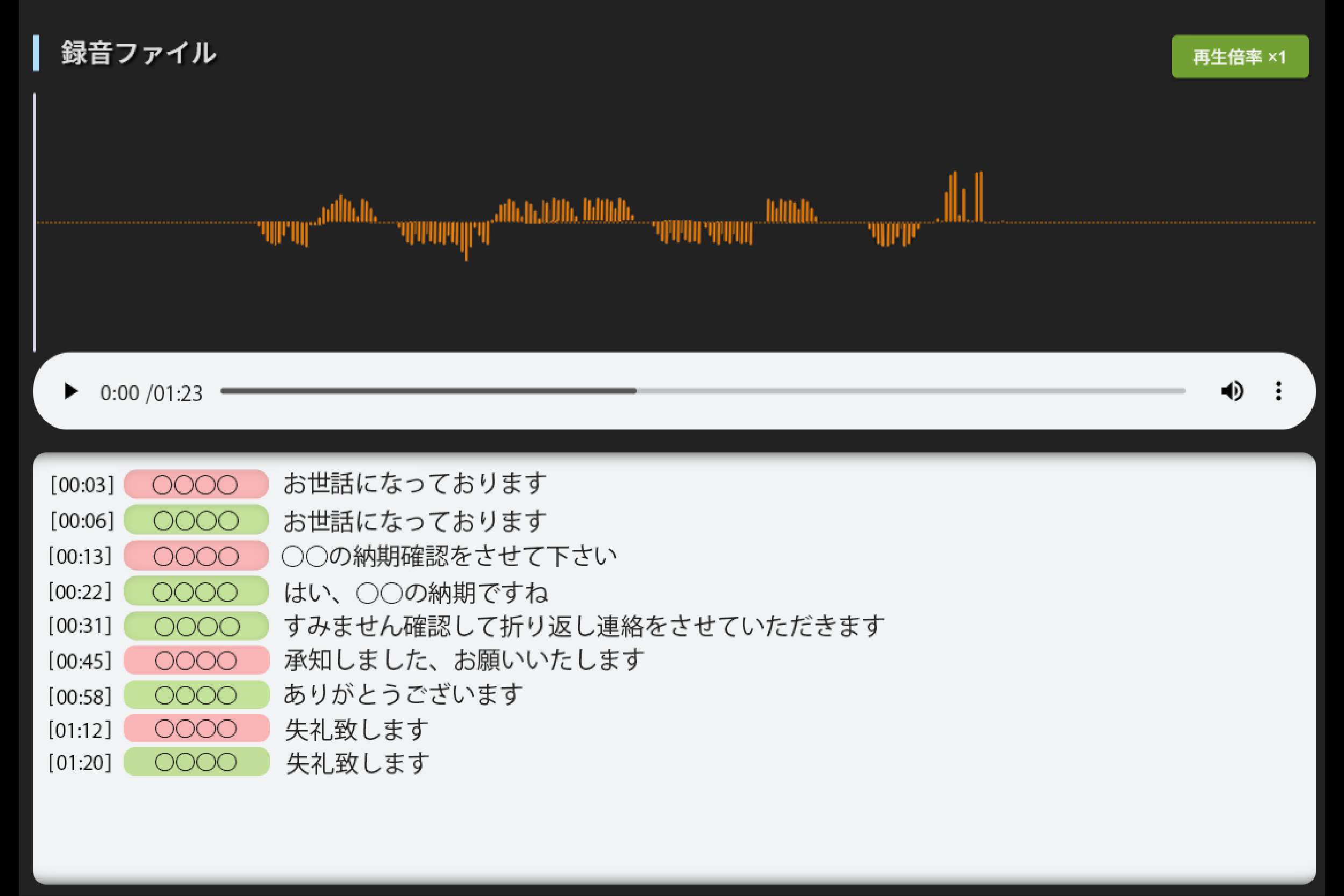 INNOVERAの管理画面にログインし、INNOVERA Textの音声テキスト化のメニューで録音音声を選択し、テキスト化を実行すると下記のような形でご確認いただけます。